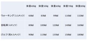 消費エネルギー(㎉)=メッツ × 時間(h)× 体重(㎏)になります